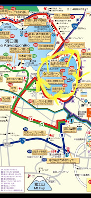 | 黃色是今天的步行路線 沿著河口湖東南緣走一圈 |
