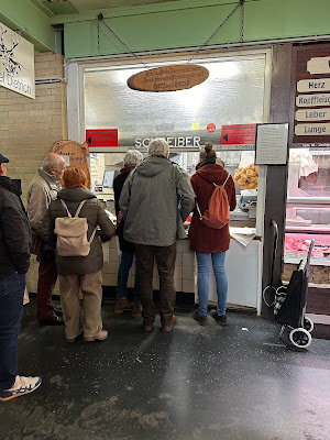 看時間約 15:30,肚子有點餓了,決定再去 Kleinmarkthalle 市場吃 Schreiber 肉腸。今天來的時間比較早,隊伍比昨天長,短髮捲捲頭女士看起來精神比昨天好,也在櫃檯旁幫忙,但卻一直碎念,可以感受到金髮女士的不耐,但仍擠出笑容面對客人。